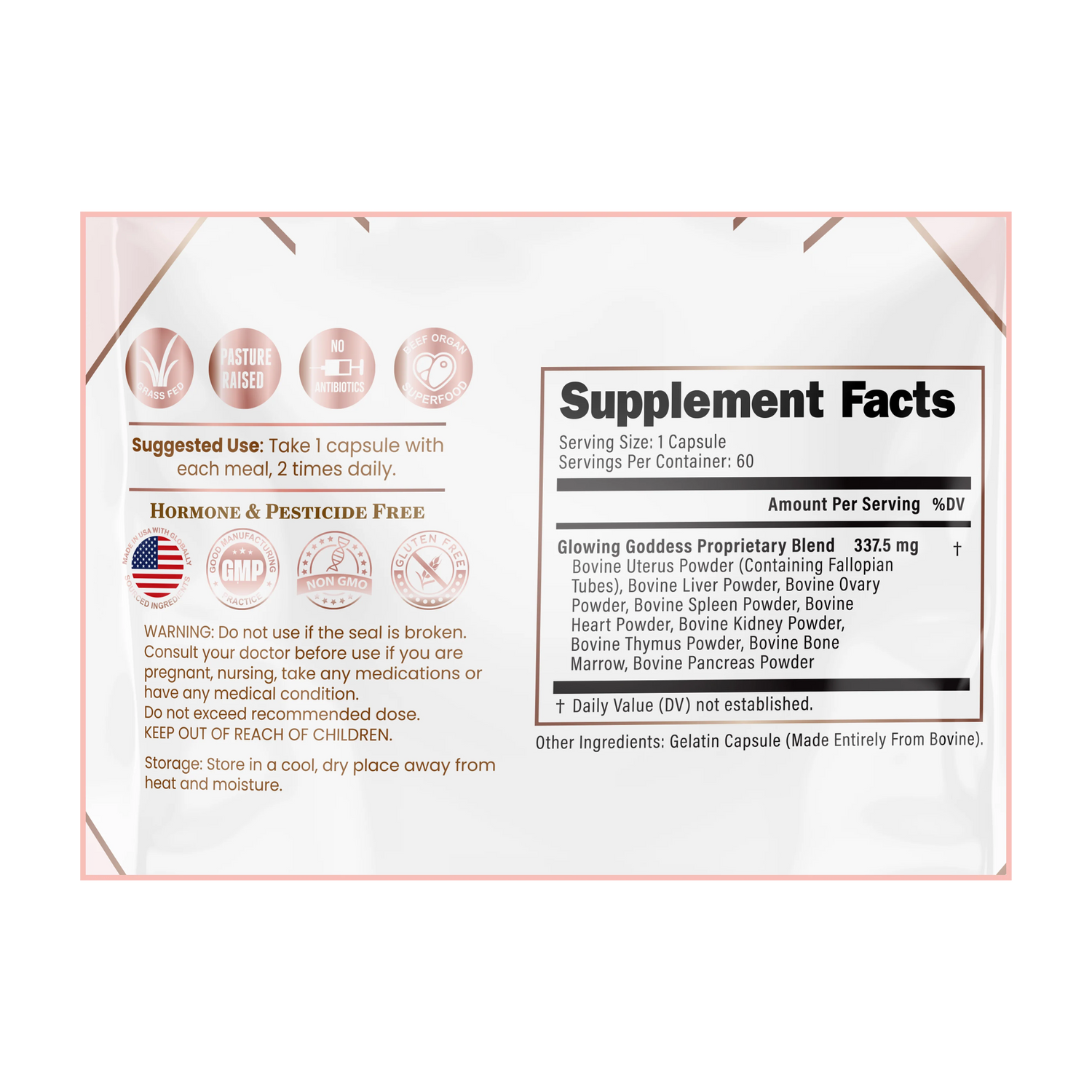 The core of the product is a proprietary blend containing 10 types of beef organ ingredients, specifically: Bovine Ovary Powder, Bovine Uterus Powder, Bovine Fallopian Tubes, Bovine Bone Marrow Powder, Bovine Liver Powder, Bovine Pancreas Powder, Bovine Heart Powder, Bovine Thymus Powder, Bovine Kidney Powder, and Bovine Spleen Powder. The capsule shell is a bovine-derived gelatin capsule.